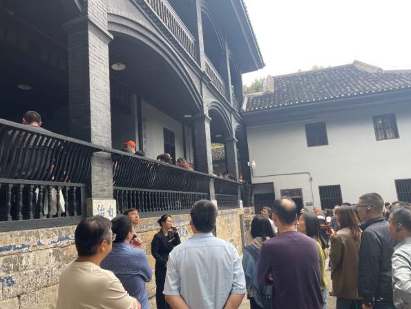 在讲解员的指引和讲解下,队伍沿着当年党中央领导们走过的青石板路来到八路军重庆办事处旧址,木质结构的小楼保留着当年的原貌。走进毛泽东、周恩来、董必武等同志的办公室和卧室,一张旧藤椅、一部老式电话机、一个装满文件的公文包,仿佛主人们刚刚离开。同志们边参观边认真倾听着讲解员讲述的董必武同志为六角钱差旅费作深刻检讨、周恩来同志拒绝领取国民党发放高薪、以及毛泽东同志以《沁园春·雪》这篇旷世杰作作为契机,领导中国共产党于重庆谈判期间在取得“政战”“枪战”成果的基础上,又打赢了“笔战”,以全胜的战绩永载史册等故事,无不感慨万千……在二楼的会议室里,复刻的南方局会议场景中,“多功能”会议桌、搪瓷缸、旧地图摆放整齐,仿佛置身当年的会议现场,感受着革命者运筹帷幄、共商国是的坚定信念。
